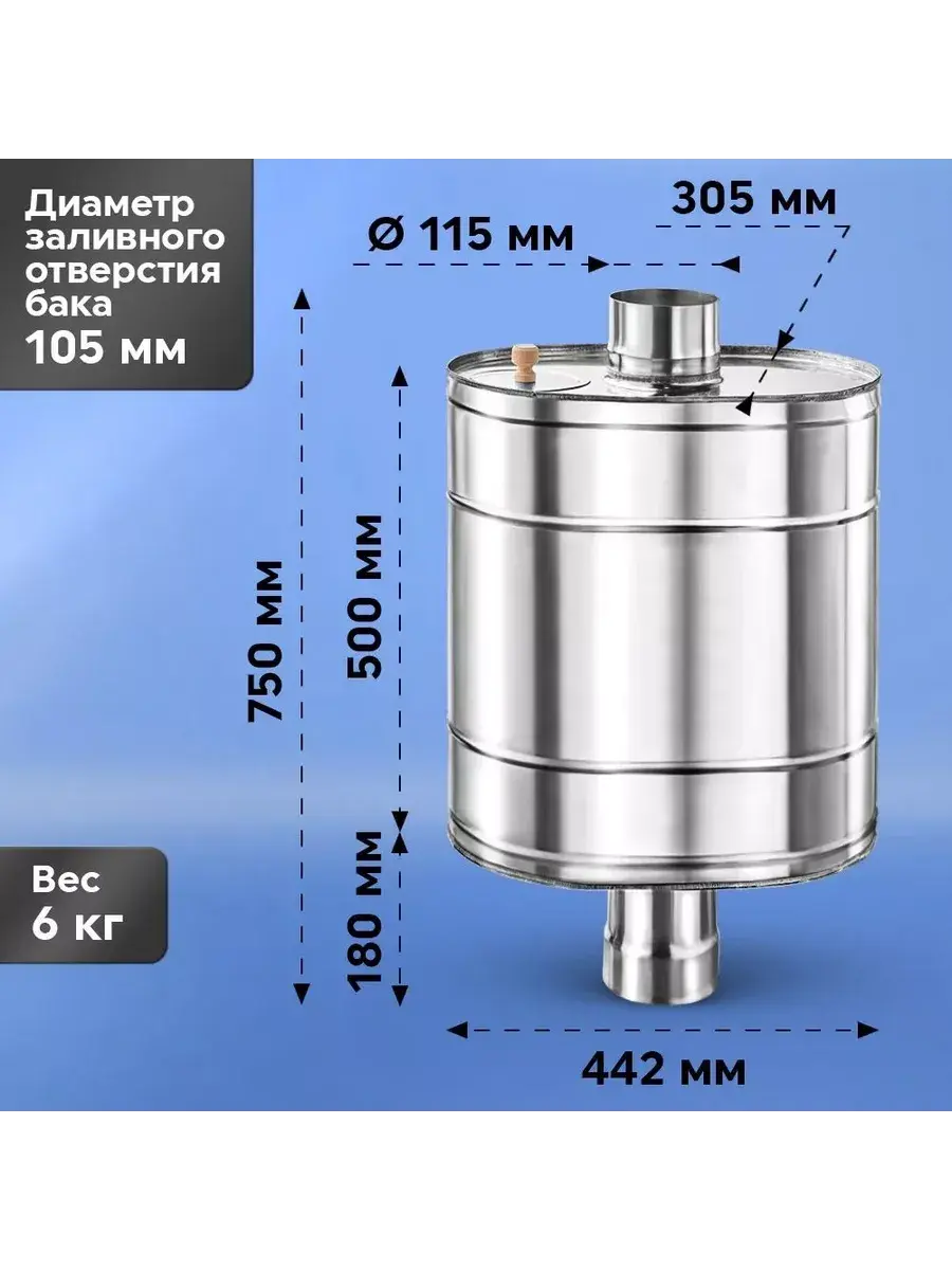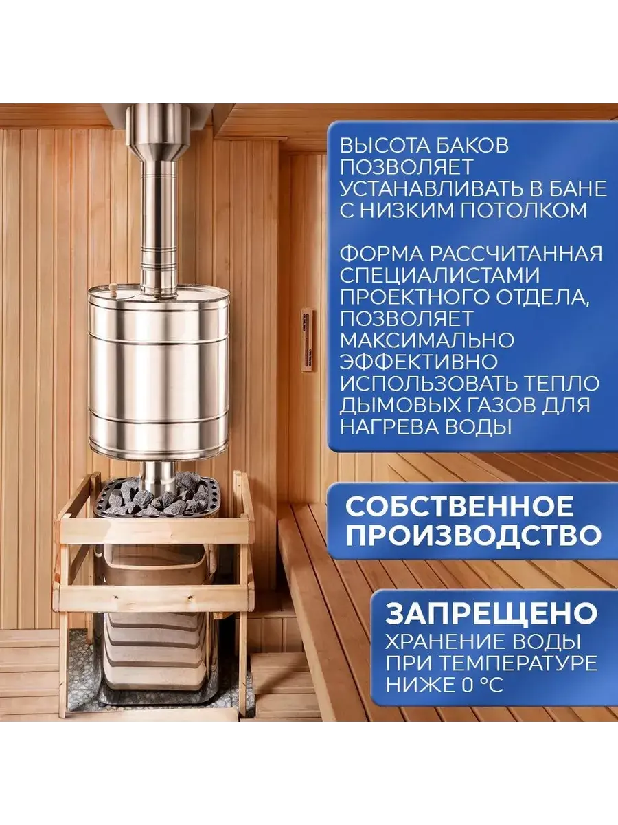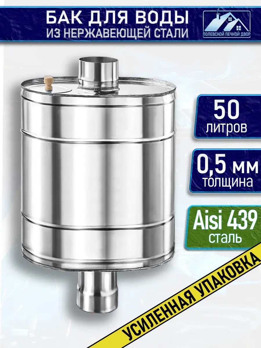 Бак на трубе для печи объемом 50 литров D 115 - это высококачественный продукт, произведенный в России. Он предназначен для отведения газов теплогенерирующего аппарата в атмосферу и нагрева технической воды. Бак изготовлен из нержавеющей стали AISI 439 толщиной 0,5 мм, что обеспечивает его долговечность и устойчивость к коррозии. Серебристый цвет товара придает ему стильный и современный вид. Преимущества: Возможно использовать на дровяных печах, котлах.Форма бака, рассчитанная специалистами проектного отдела, позволяет максимально эффективно использовать тепло дымовых газов для нагрева воды. Поверхность бака не требует особого ухода. Это делает его использование удобным и практичным.Бак оснащен крышкой и штуцером 3/4", что позволяет контролировать уровень воды и обеспечивает безопасность использования.Вес бака составляет 6,078 кг, что делает его устойчивым и надежным. Крышка бака обеспечивает дополнительную защиту от попадания пыли и грязи внутрь бака. Бак для бани произведен в России, что гарантирует высокое качество продукта.