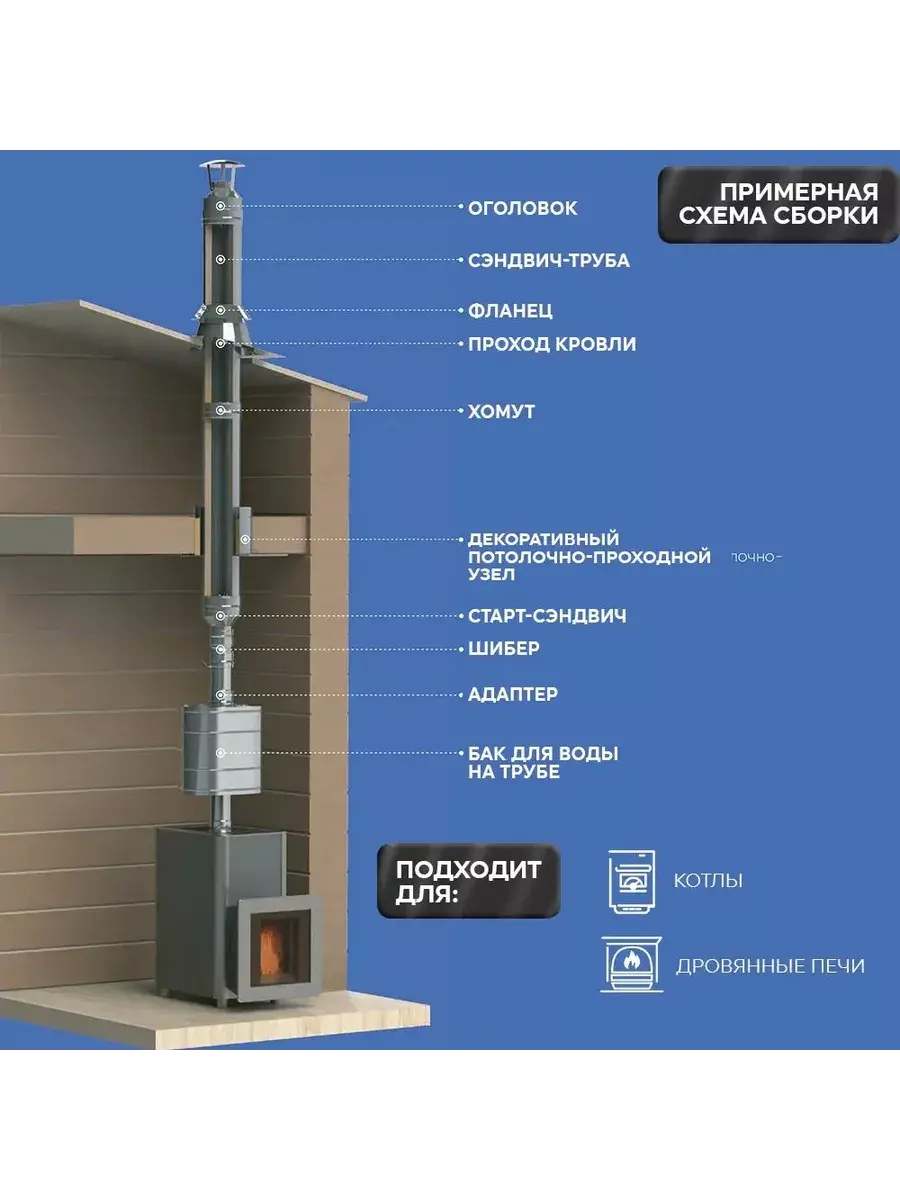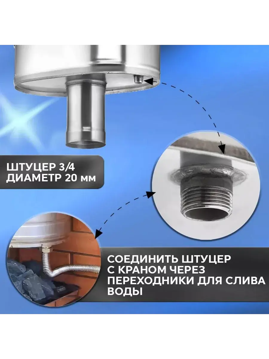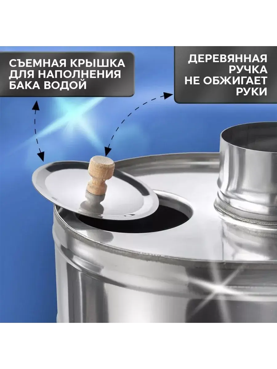 Бак на трубе для печи объемом 50 литров D 115 - это высококачественный продукт, произведенный в России. Он предназначен для отведения газов теплогенерирующего аппарата в атмосферу и нагрева технической воды. Бак изготовлен из нержавеющей стали AISI 439 толщиной 0,5 мм, что обеспечивает его долговечность и устойчивость к коррозии. Серебристый цвет товара придает ему стильный и современный вид. Преимущества: Возможно использовать на дровяных печах, котлах.Форма бака, рассчитанная специалистами проектного отдела, позволяет максимально эффективно использовать тепло дымовых газов для нагрева воды. Поверхность бака не требует особого ухода. Это делает его использование удобным и практичным.Бак оснащен крышкой и штуцером 3/4", что позволяет контролировать уровень воды и обеспечивает безопасность использования.Вес бака составляет 6,078 кг, что делает его устойчивым и надежным. Крышка бака обеспечивает дополнительную защиту от попадания пыли и грязи внутрь бака. Бак для бани произведен в России, что гарантирует высокое качество продукта.