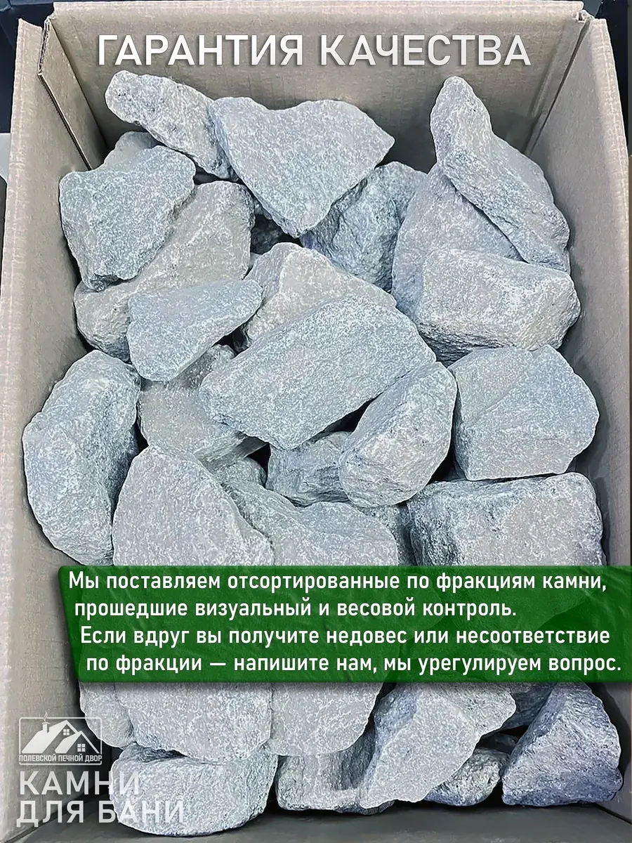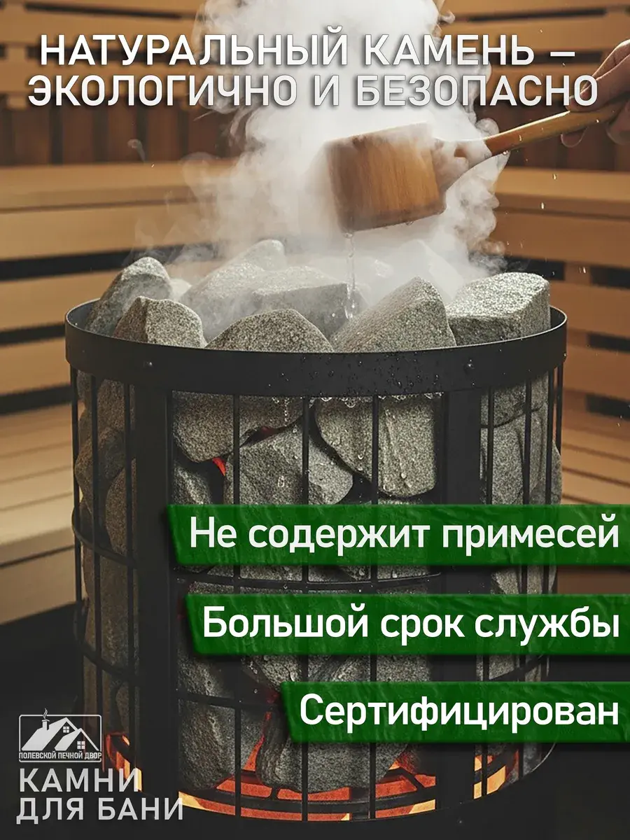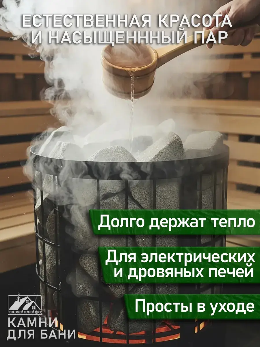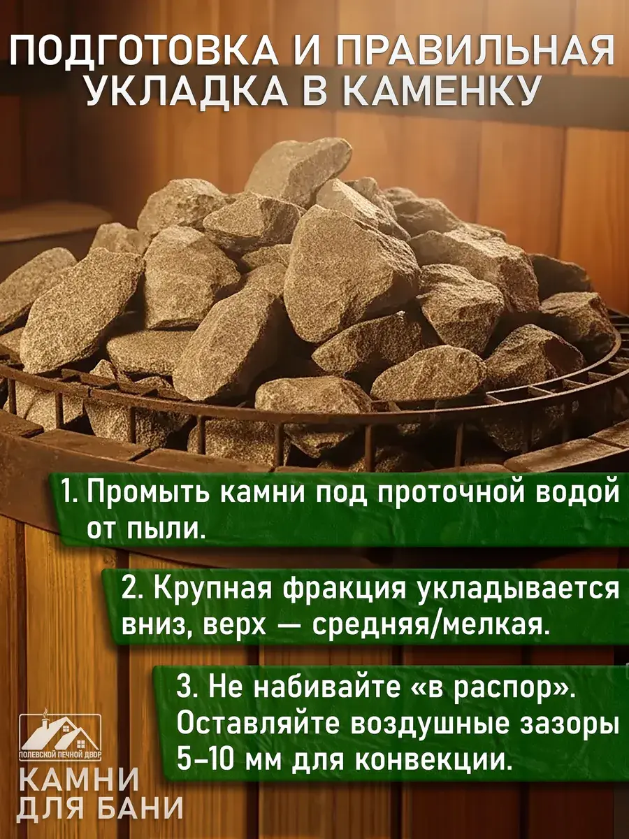 Подходит в электрокаменку, чугунную и газовую печь. При укладке, вниз кладут крупные камни, сверху меньшего размера. Можно разбавлять с другими сортами как банный микс. Этот товар подойдет как подарок для ценителей качественного пара.