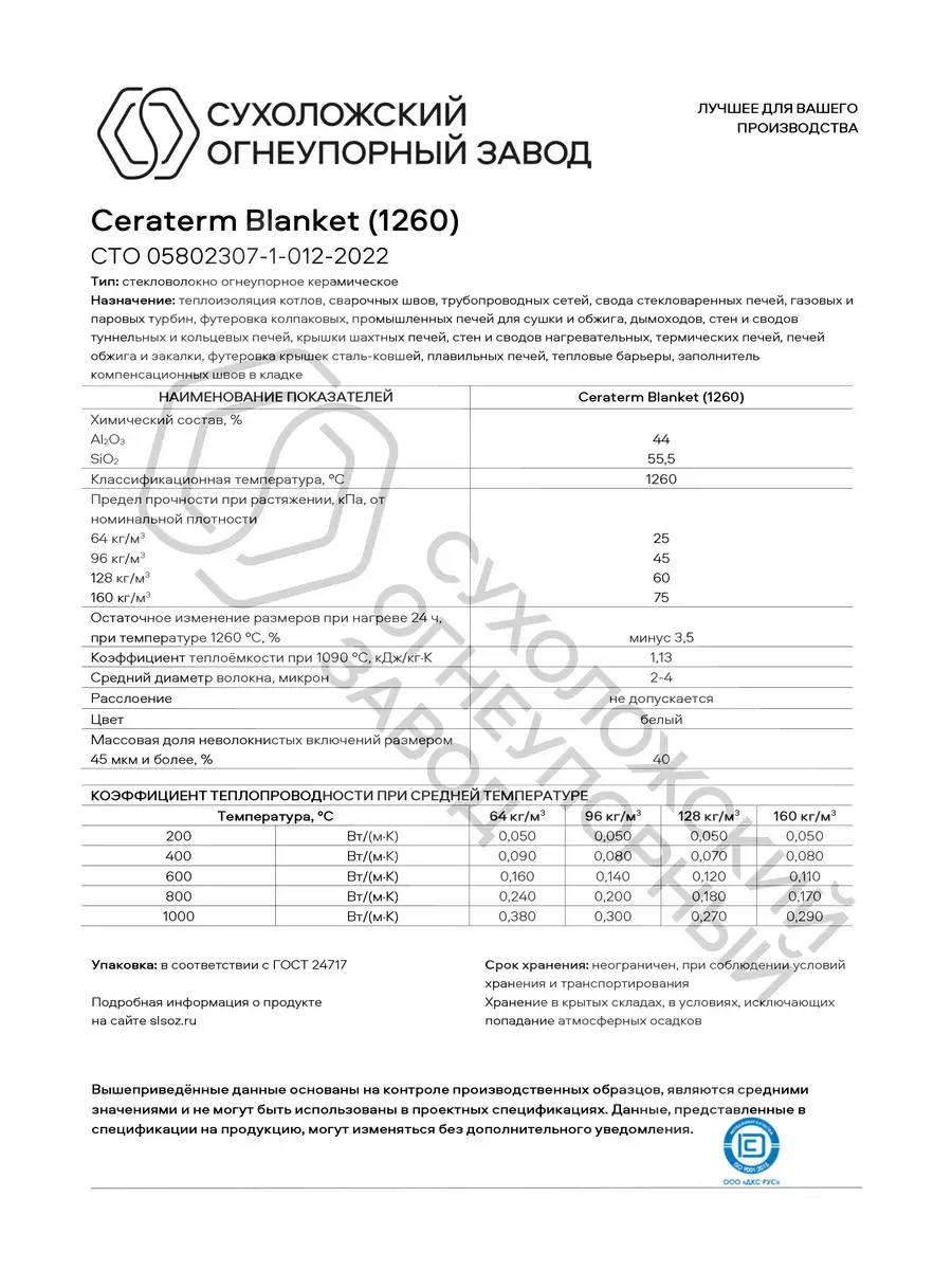 Керамическое волокно/одеяло/ Длина 1000 мм Ширина 610 мм Толщина 25 мм