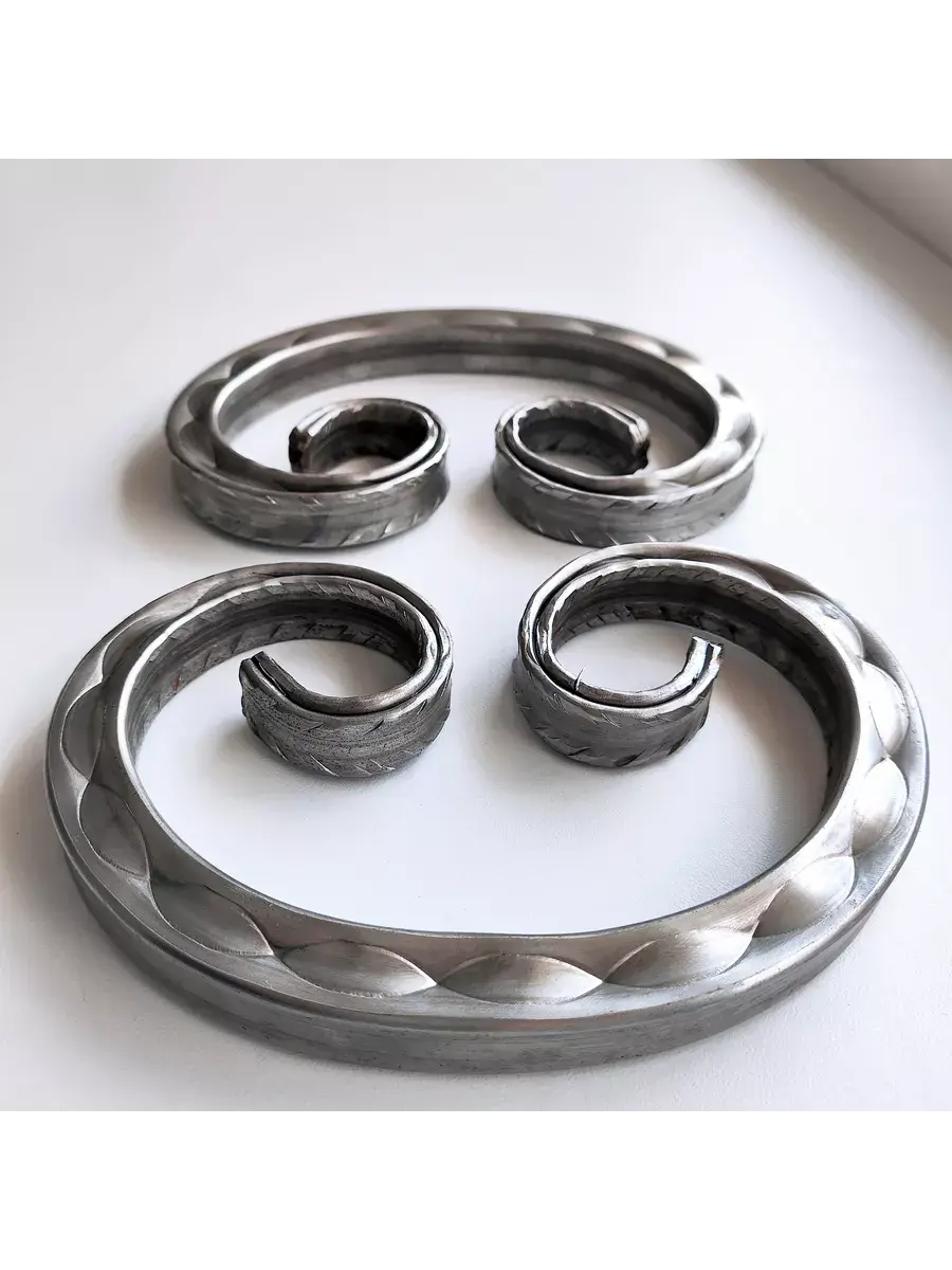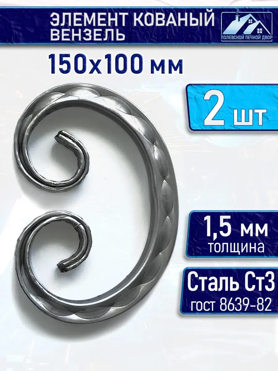 Габариты изделия: длина — 150 мм, ширина — 100 мм, высота — 15 мм. Ширина и высота прутка — 15 мм. Толщина стали — 1,5 мм. 2 штуки. Кованый элемент «Вензель» представляет собой декоративный аксессуар для оформления интерьера, изготовленный методом ковки из металла.