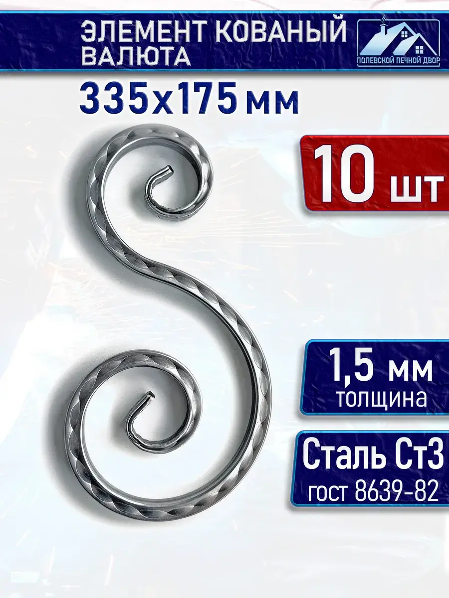 Габариты изделия: длина - 335 мм, ширина - 175 мм, высота - 15 мм. Ширина и высота прутка: 15 мм. Толщина стали - 1,5 мм. Кованый элемент “Валюта” представляет собой декоративный аксессуар для оформления интерьера, изготовленный методом ковки из металла. Он обычно имеет сложную геометрическую форму с симметричными узорами, имитирующими старинные монеты или гербы.