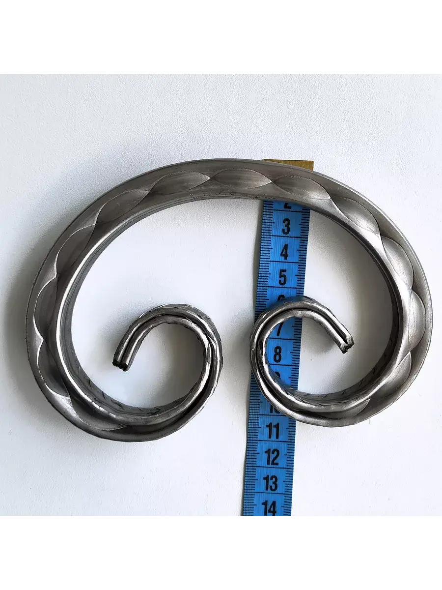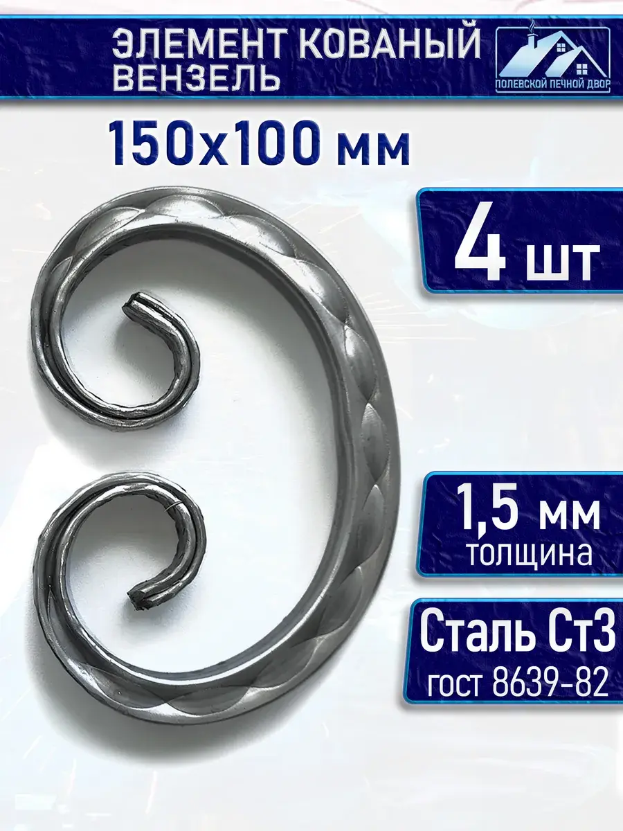 Габариты изделия: длина — 150 мм, ширина — 100 мм, высота — 15 мм. Ширина и высота прутка — 15 мм. Толщина стали — 1,5 мм. 4 штуки. Кованый элемент «Вензель» представляет собой декоративный аксессуар для оформления интерьера, изготовленный методом ковки из металла.