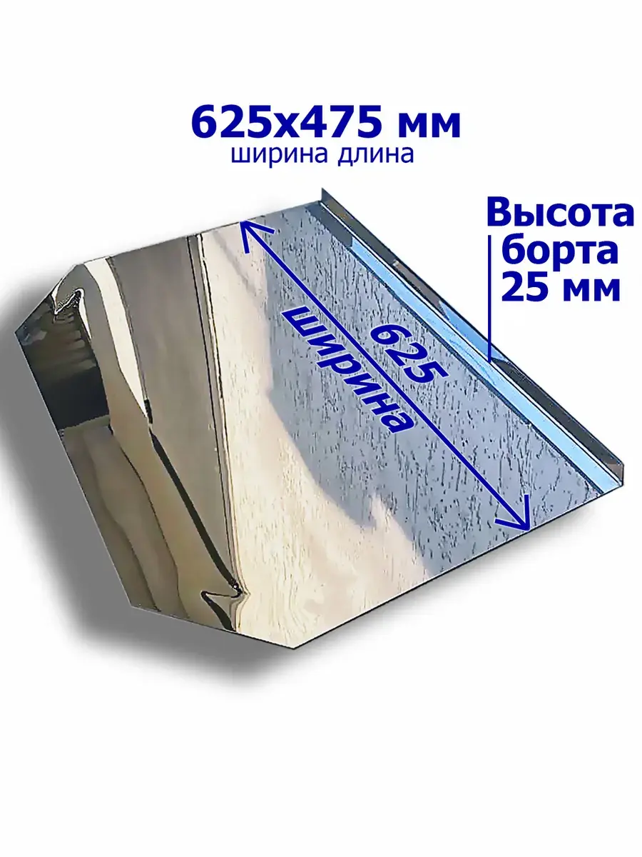 Ширина считается по стороне с загибом - 625 мм. Высота борта - 25 мм. Длина 475 мм. Толщина 0.5 мм. Сталь нержавеющая Aisi 430.