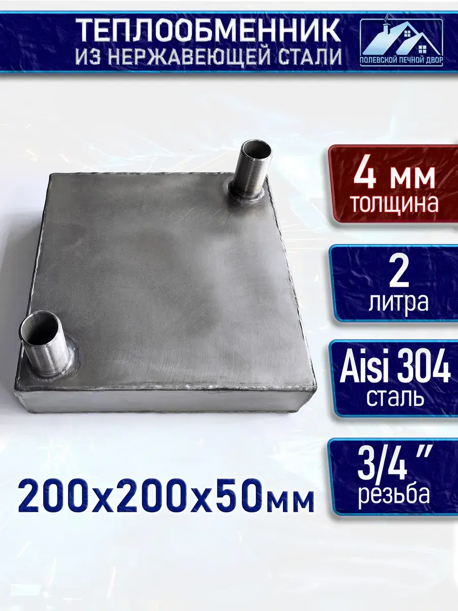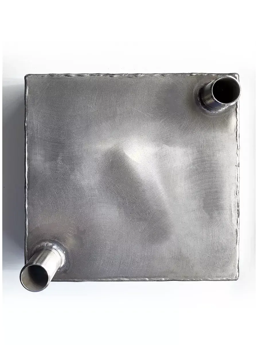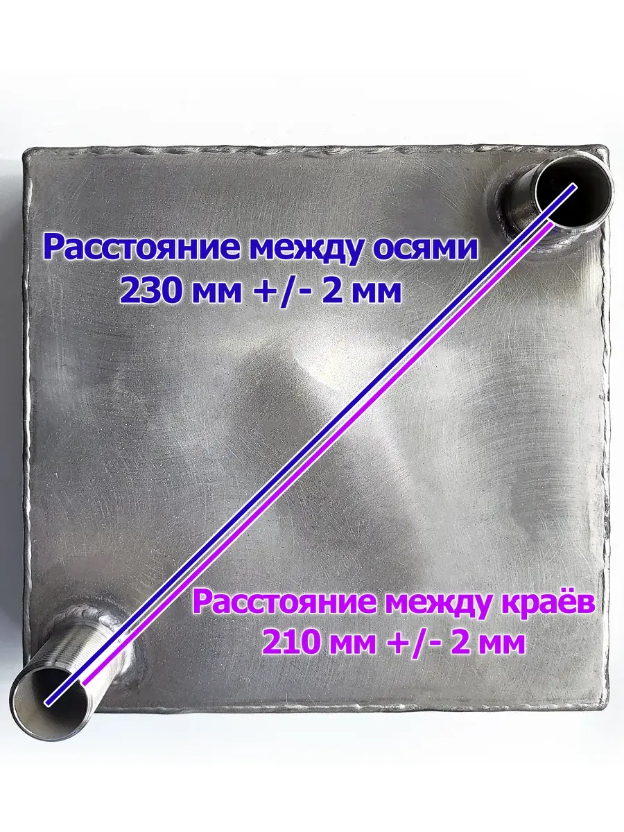 Габариты теплообменника: Высота (толщина) 50 мм, длина 200 мм, ширина 200 мм.