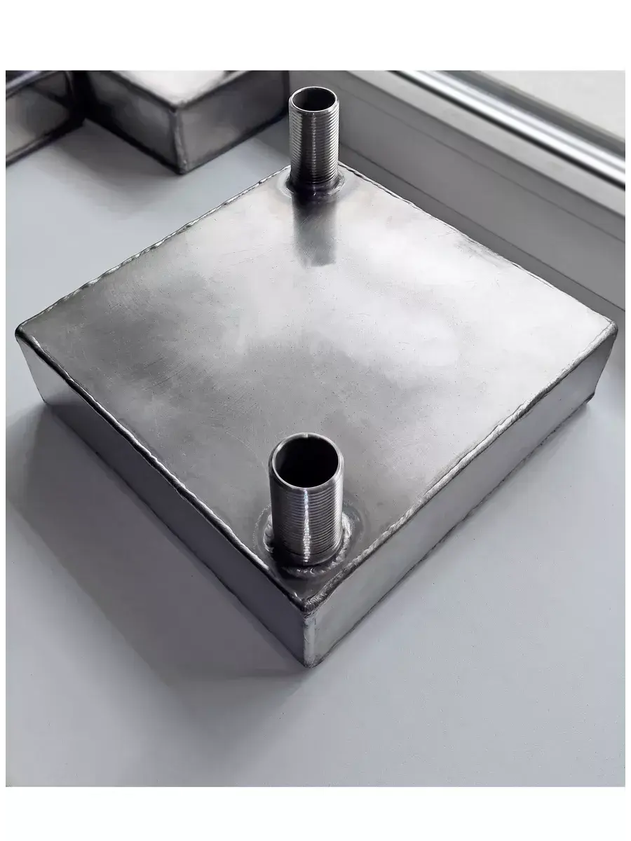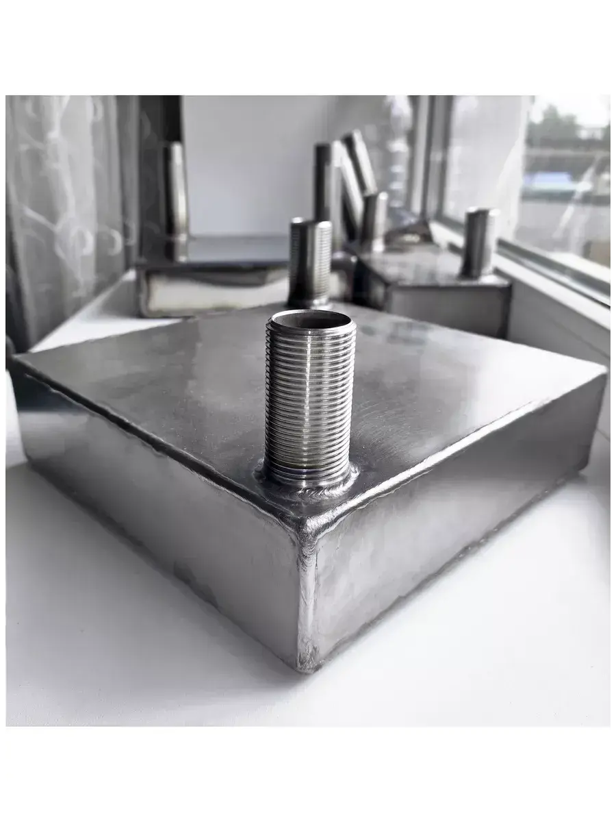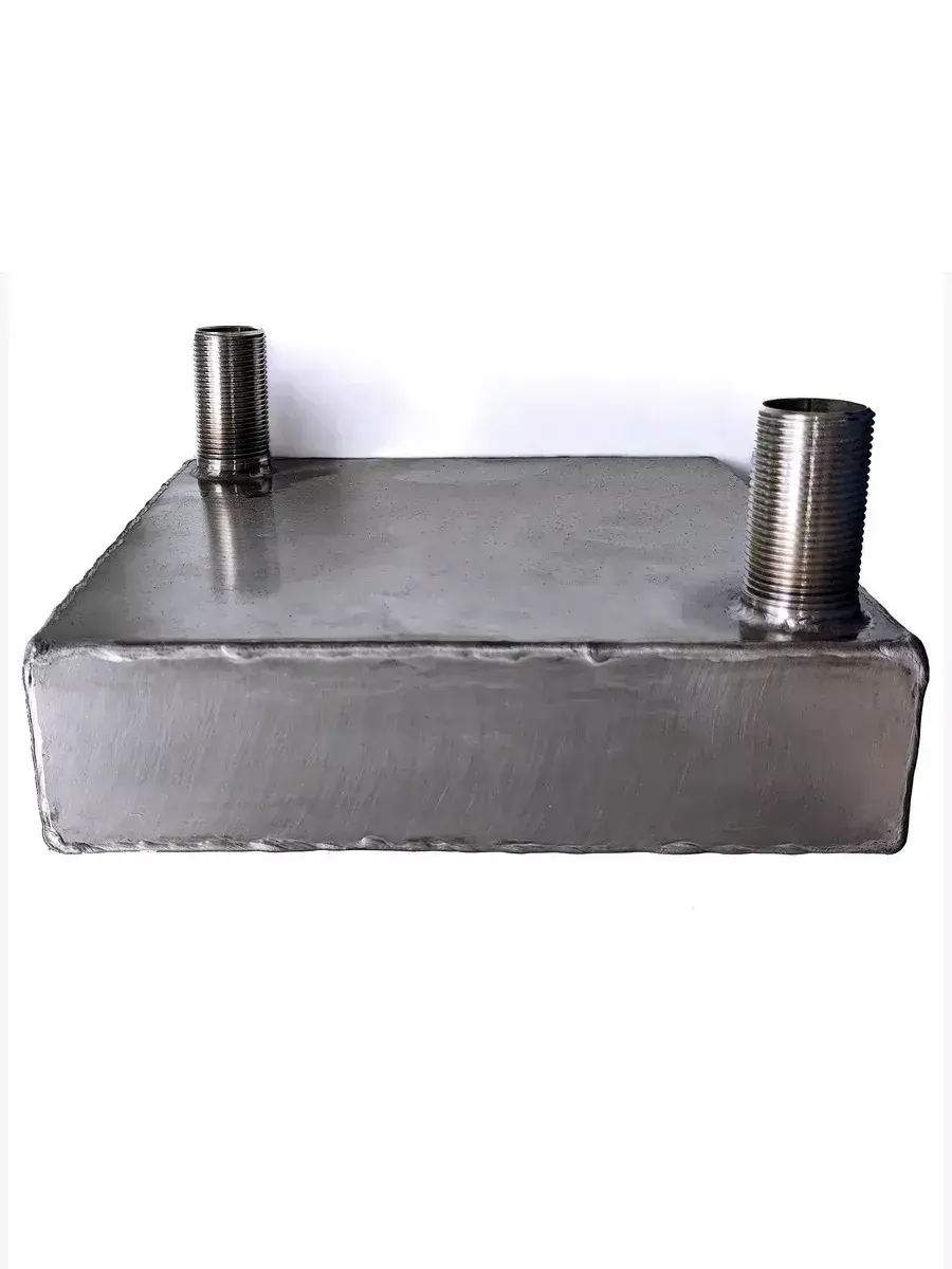 Габариты теплообменника: Высота (толщина) 50 мм, длина 200 мм, ширина 200 мм.