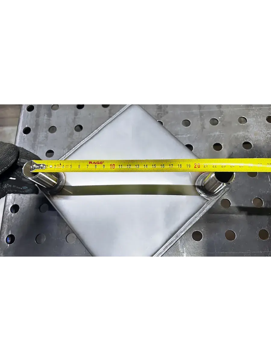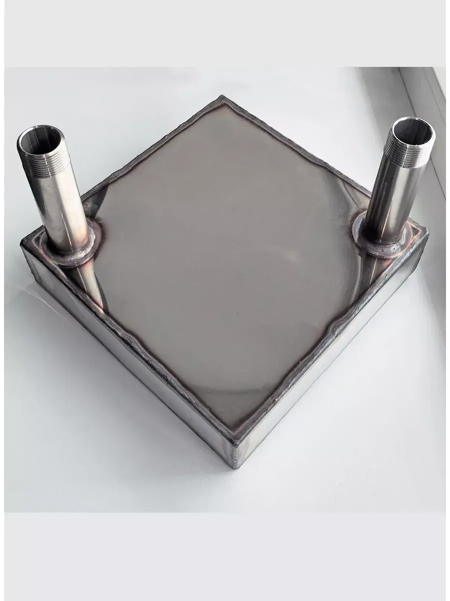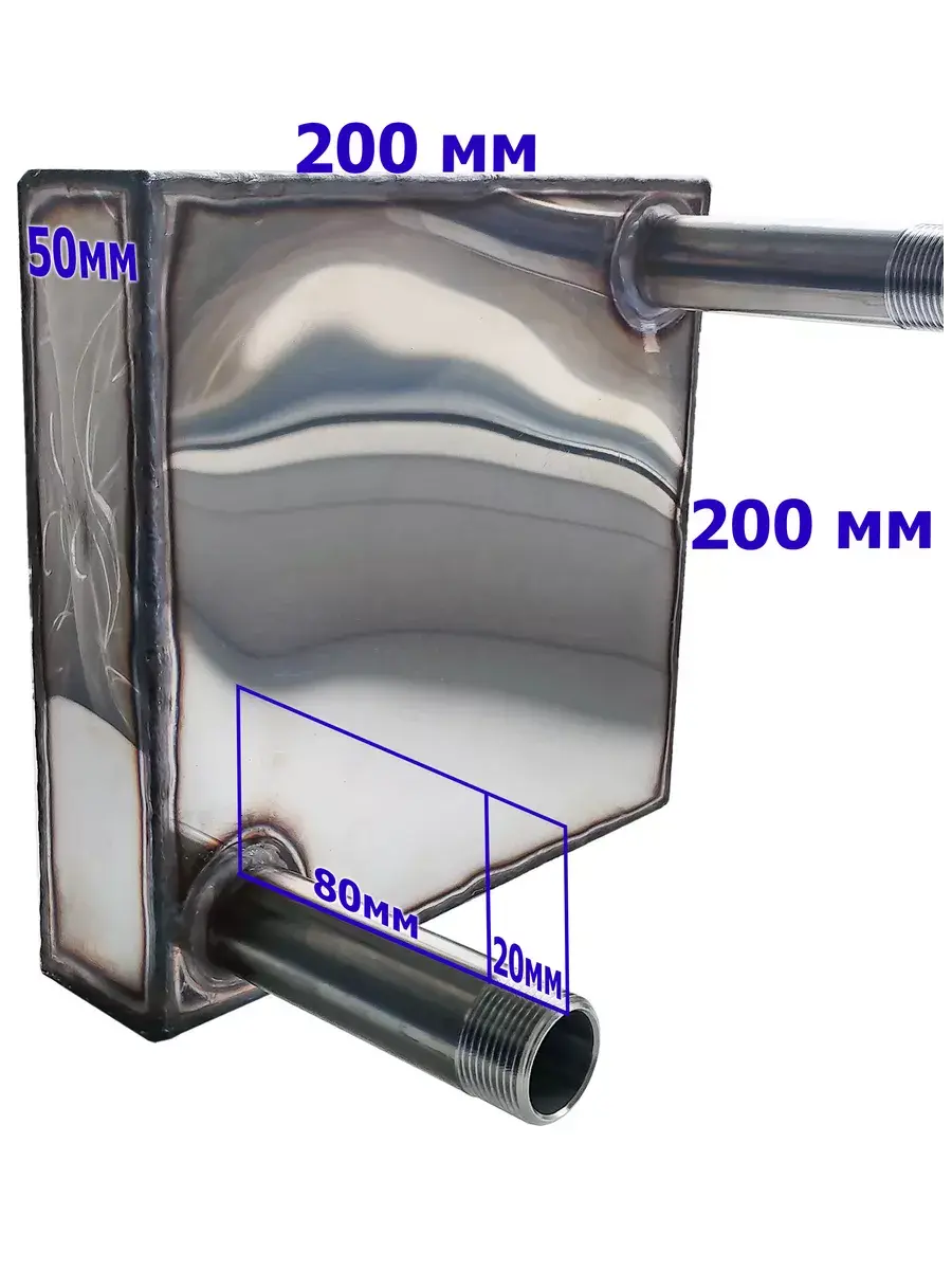 Габариты теплообменника: Высота (толщина) 50 мм, длина 200 мм, ширина 200 мм.