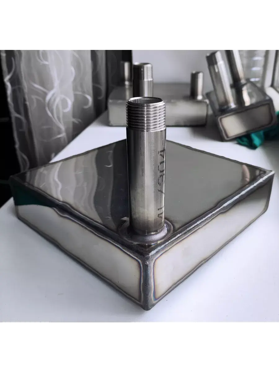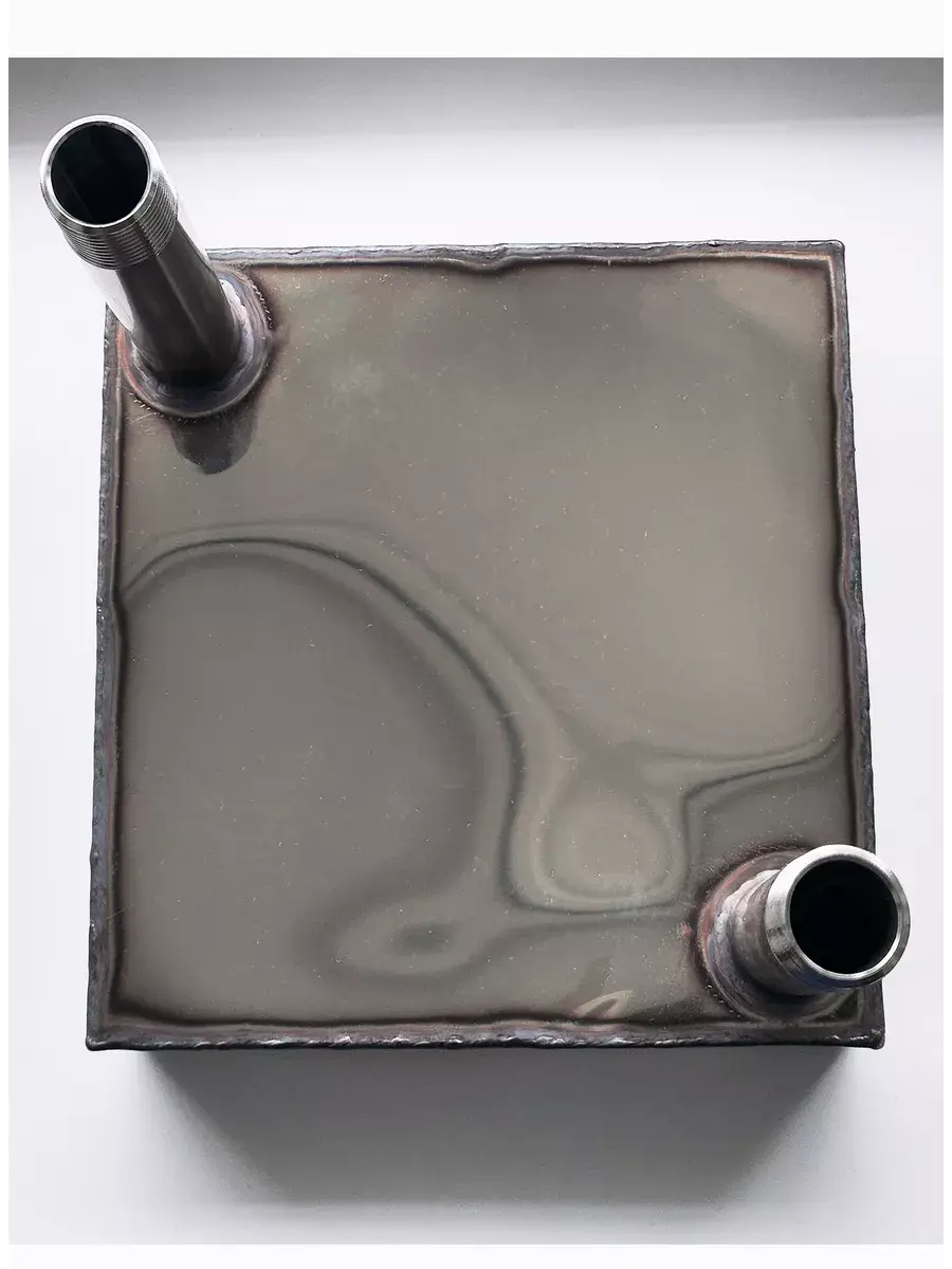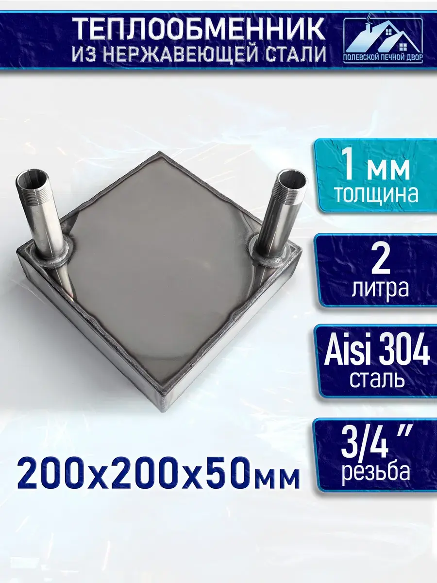 Габариты теплообменника: Высота (толщина) 50 мм, длина 200 мм, ширина 200 мм.