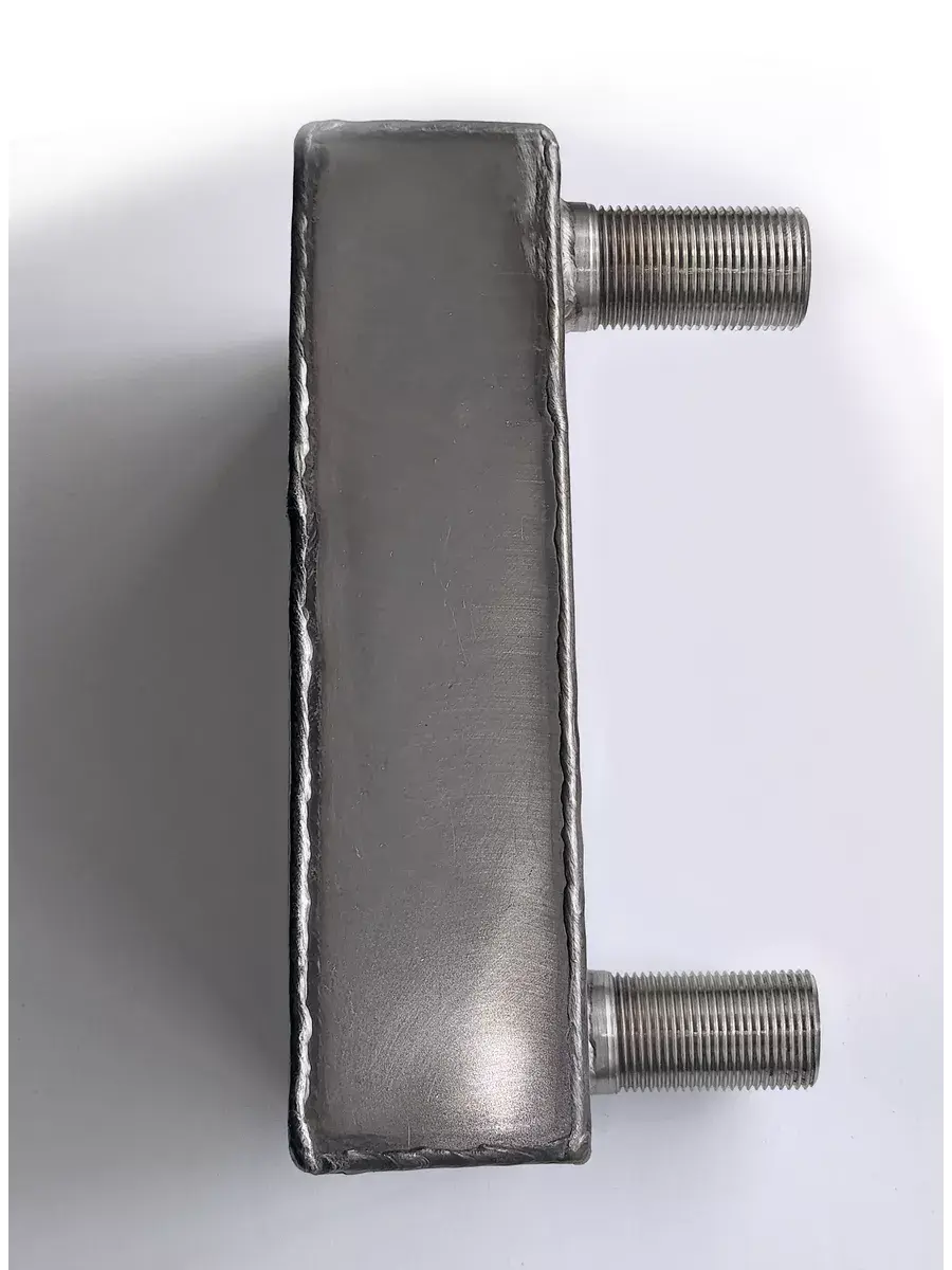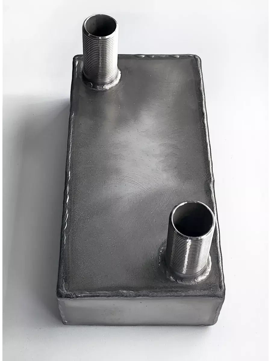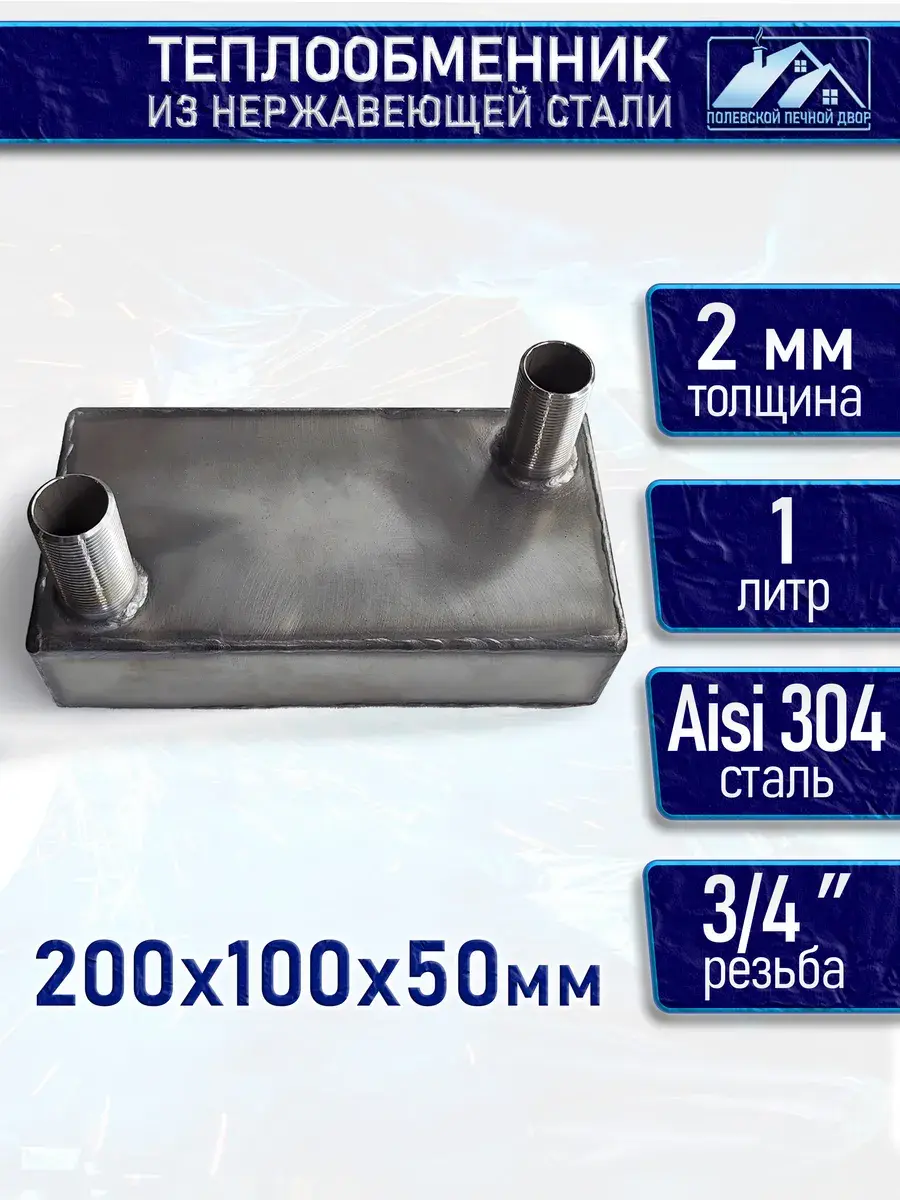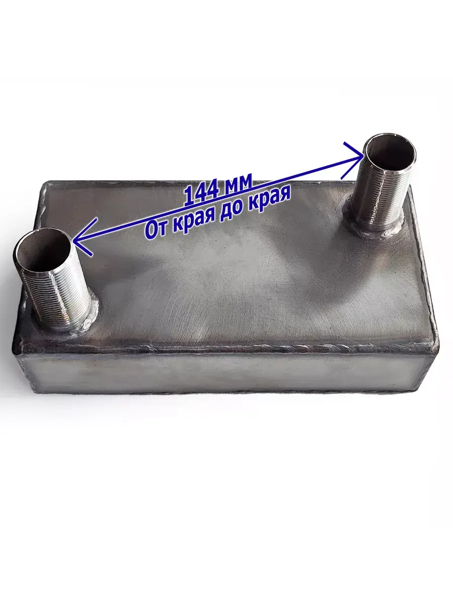 Теплообменник (регистр) для печи в баню универсальный предназначен для эффективного нагрева воды в выносном баке или отопительной системе за счет естественной циркуляции, в печах-каменках для бани, отопительных печах и каминах. Марка стали AISI 304 матовая, толщина металла 2 мм. Габариты теплообменника: Высота (толщина) 50 мм, длина 200 мм, ширина 100 мм. Объём воды 1 л. Диаметр штуцеров 3/4". Расстояние между краями двух труб 144 мм +/- 2 мм.