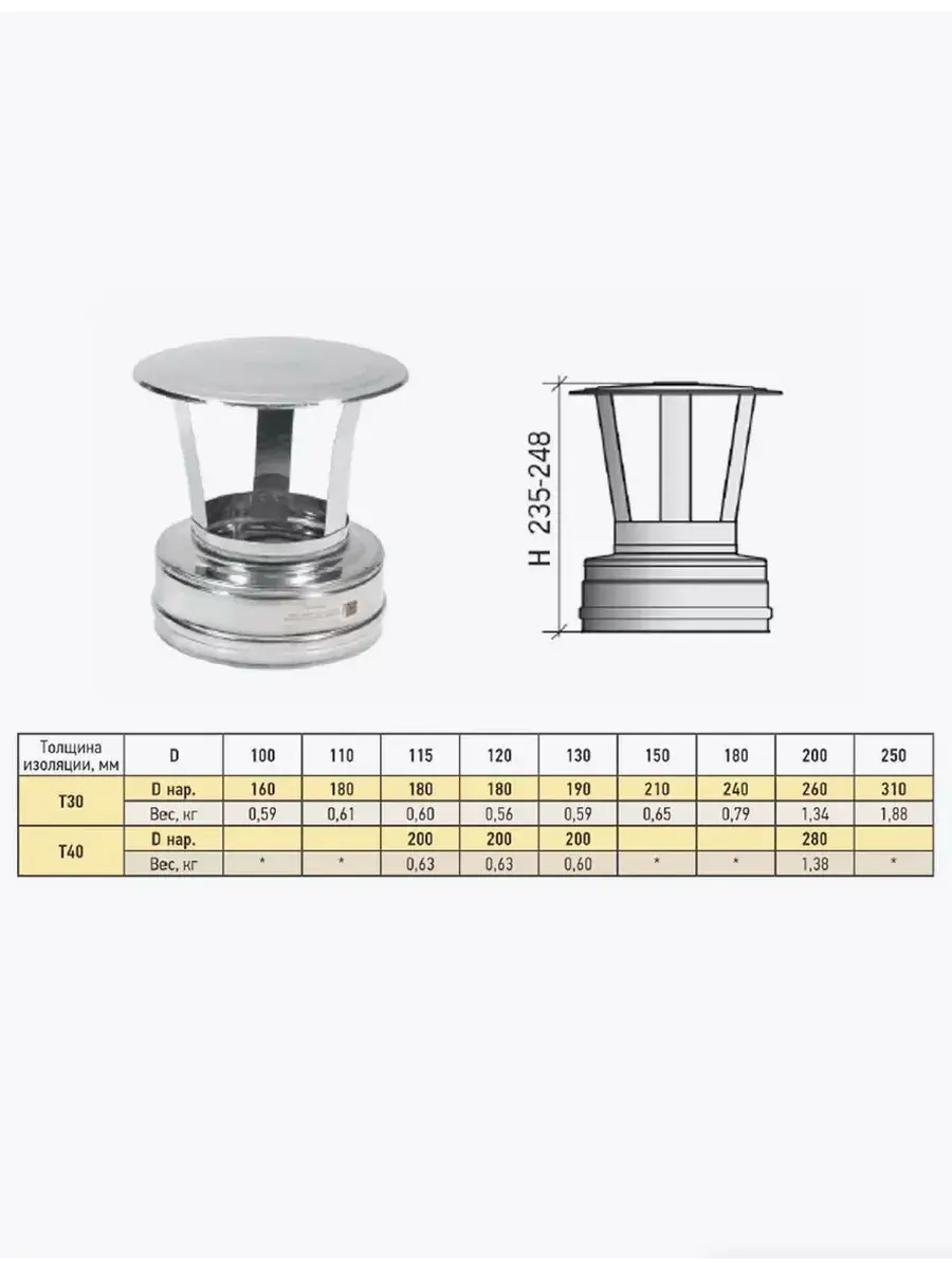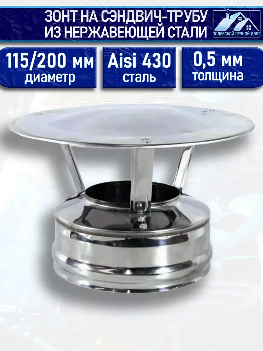 Зонт на трубу имеет внутренний диаметр 115 мм и внешний диаметр 200 мм, что позволяет использовать его как для маленьких, так и для больших дымоходов. Толщина стенок составляет всего 0.5 мм, но при этом он обладает высокой прочностью благодаря своей конструкции.